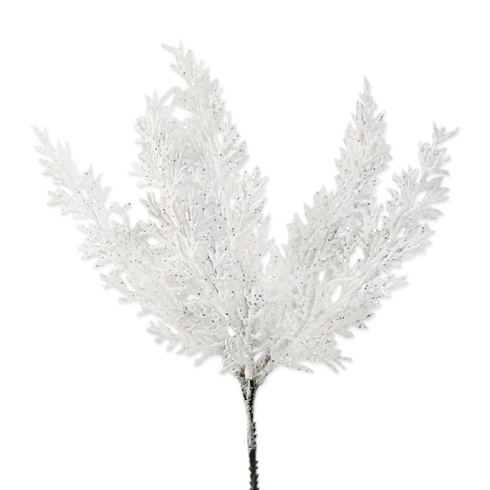 Zápich cypřiše v mrazivě bílém provedení – jemný detail pro zimní dekorace a věnce.