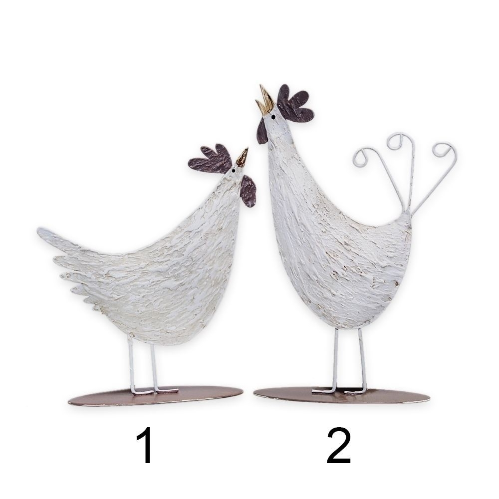Menší kovová slepice nebo kohout, dekorace s charakterem.