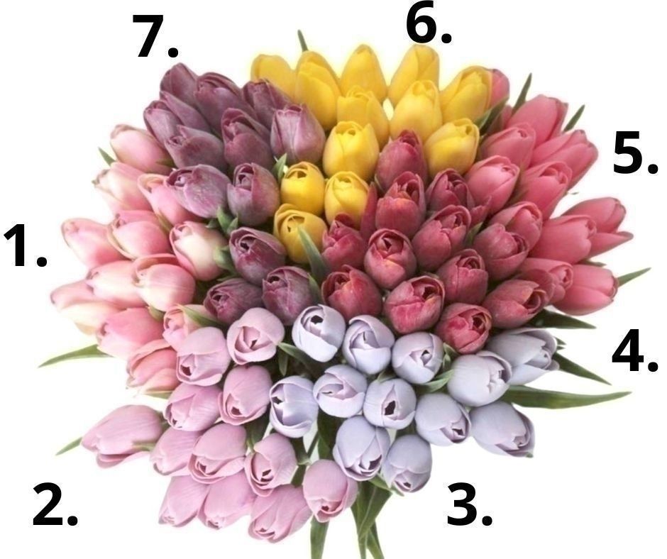 1 - růžovo-krémová, 2 - sv.růžová, 3 - lila, 4 - červená, 5 - růžová, 6 - žlutá, 7 -fialová