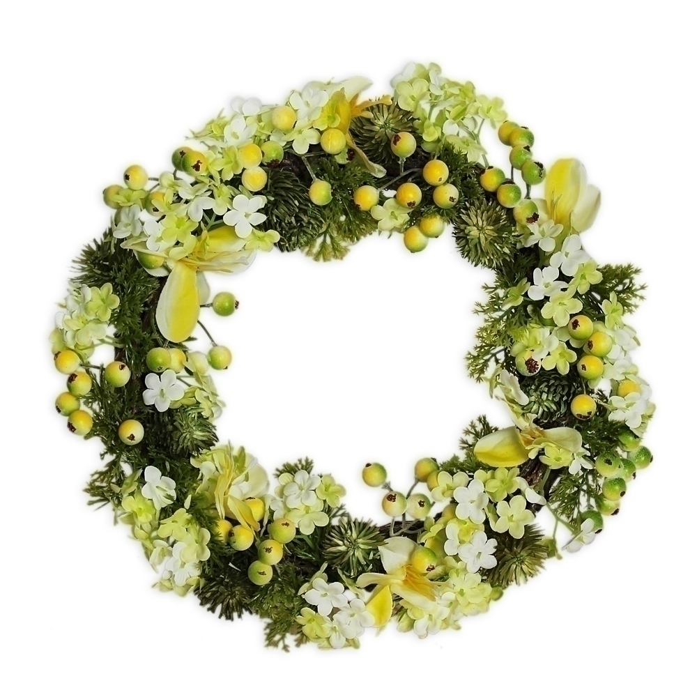 Zářivě žlutý květinový věnec okamžitě rozjasní váš domov. Ideální pro jaro, léto i veselou celoroční výzdobu.