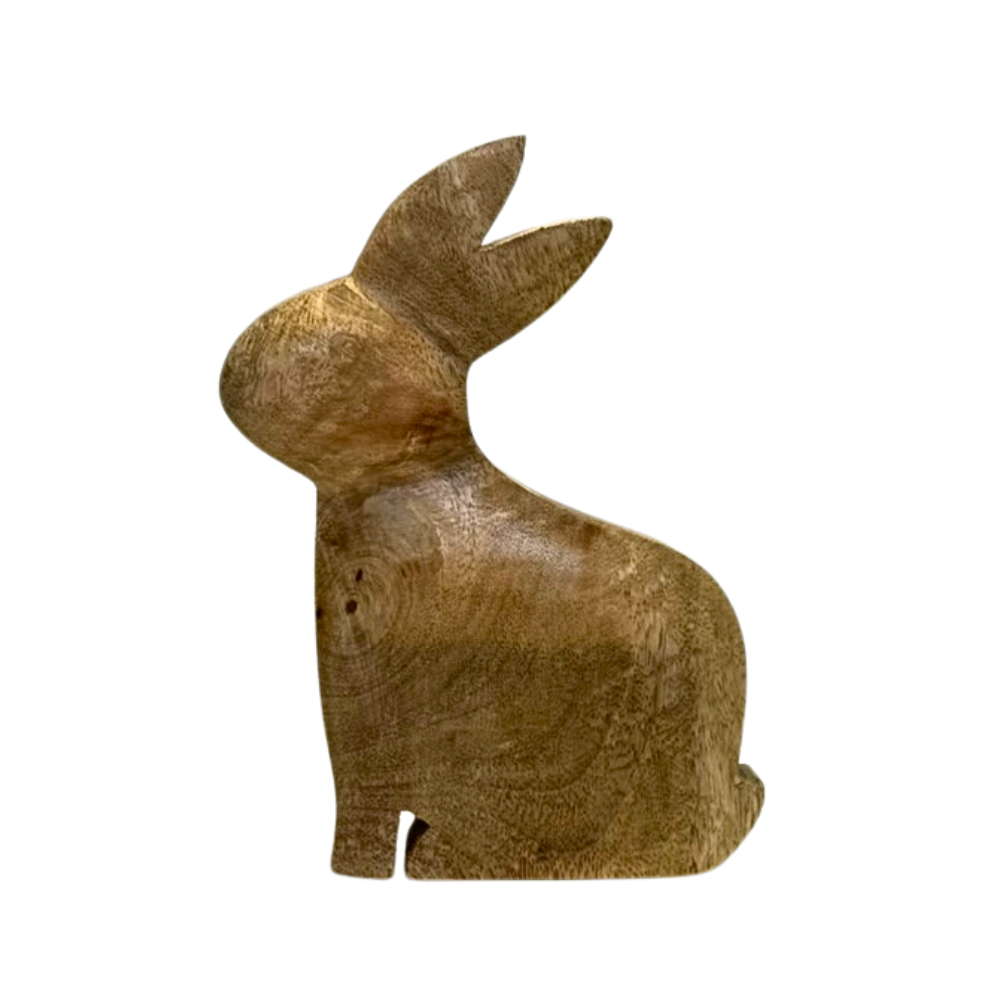 Dřevěný zajíc střední velikosti, který vnese do domova veselou náladu. Hodí se na poličku či stůl.